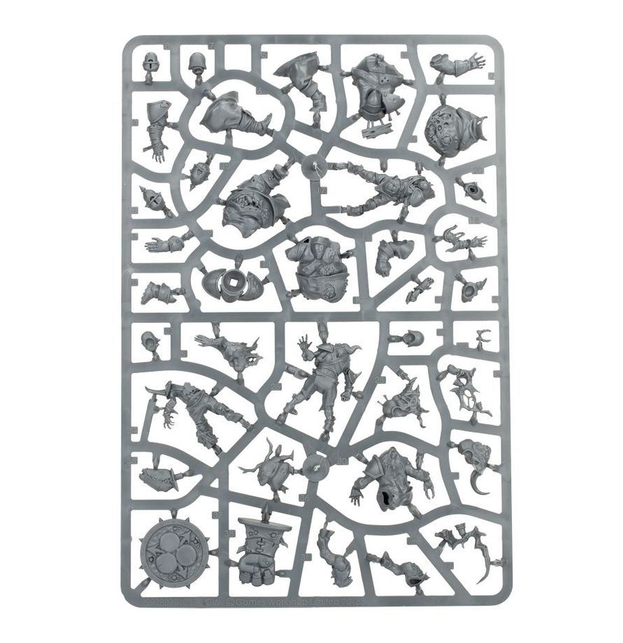 This multi-part plastic kit contains the components necessary to assemble Nurgle’s Rotters, a particularly foul and dripsome Nurgle team for use in games of Blood Bowl. Appropriately putrid and ‘orrible, each player is mutated and pus-covered with exposed guts, claws and warts featuring heavily. The team consists of 4 Bloaters, 2 Pestigor and 6 Rotters.