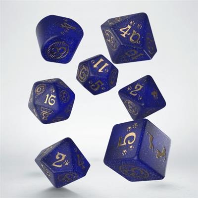 Here's the CATS Modern Dice Set: Meowster. Dark blue as the late evening sky, sparkling with tiny embers from the campfire; an effect provided by the material being mixed with glitter dust. The engravings are painted matte gold, making them classy and showing playful cats in their everyday activities. Beautiful, legible, fabulous. Just as you like it, just as you want it, just as you need it!