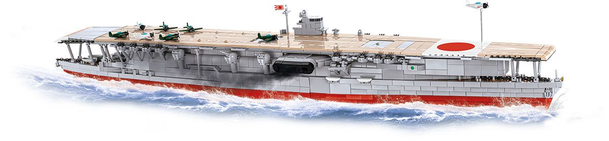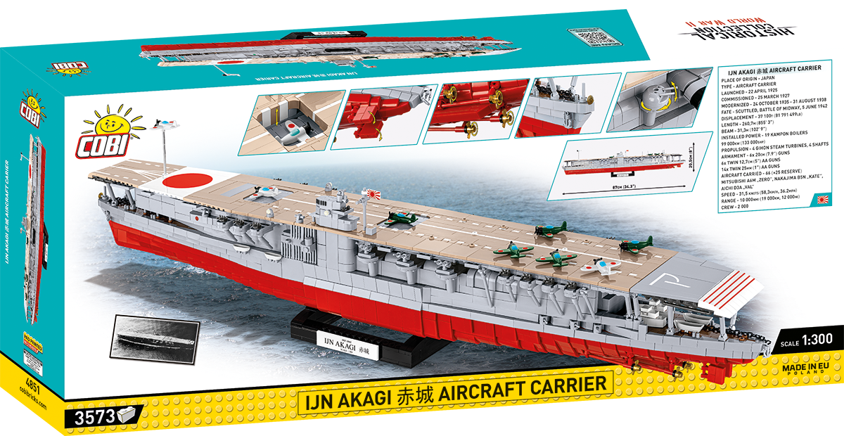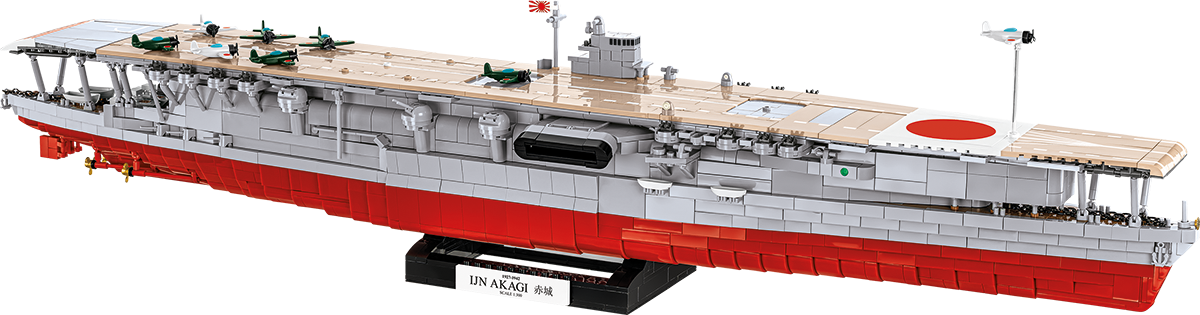 Das von COBI erstellte Schiffsmodell wurde im Maßstab 1:300 hergestellt. Es besteht aus 3.573 Elementen und ist 87 cm lang. Dank der Verwendung neuester verfügbarer Elemente und fortschrittlicher Bautechniken spiegelt das Modell die Proportionen des historischen Schiffes so originalgetreu wie möglich wider und behält alle wichtigen Elemente bei. Eine sehr interessante Designlösung sind zwei bewegliche Flugzeugaufzüge, die wir anheben und absenken können. Der Akagi-Flugzeugträger verfügt über zahlreiche bewegliche Teile wie Propeller, Ruder, rotierende Geschütztürme und Kanonenrohre, die angehoben und abgesenkt werden können. Auf dem Deck des Flugzeugträgers können wir 5 bunte Miniflugzeuge mit Aufdrucken platzieren, die im Set enthalten sind! Das Set enthält außerdem einen sehr stabilen und ästhetischen schwarzen Ausstellungsständer mit einem Schild, auf dem der Name und der Maßstab des Schiffes aufgedruckt sind.