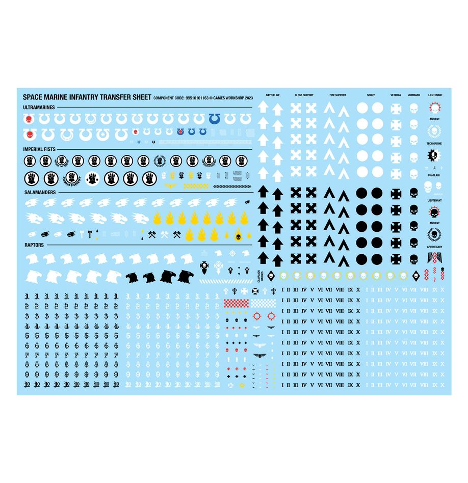 Dieser Bausatz enthält 1 Abziehbilderbogen für Space-Marine-Infanterie mit 758 hochwertigen Abziehbildern. Darunter finden sich Ordenssymbole der Ultramarines, Imperial Fists, Salamanders und Raptors sowie Abzeichen für verschiedene Schlachtfeldrollen, Ziffern und mehr.